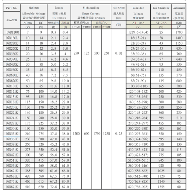 07D系列压敏电阻应用于各种小型的通讯模块、电源和家电等产品中