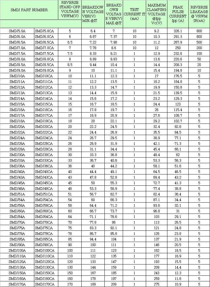 TVS 管和稳压管一样,也是反向应用的。其中VR 称为最大转折电压,是反向击穿之前的临界电压。VB 是击穿电压,其对应的反向电流IT 一般取值为1 mA。VC 是最大箝位电压,当TVS 管中流过的峰值电流为IPP 的大电流时,管子两端电压就不再上升了。因此TVS 管能够始终把被保护的器件或设备的端口电压限制在VB~VC 的有效区内。与稳压管不同的是,IPP 的数值可达数百安培,而箝位响应时间仅为1×10-12s。TVS 的最大允许脉冲功率为PM=VCIPP,且在给定最大钳位电压下,功耗PM 越大,其浪涌电流的承受能力越大。