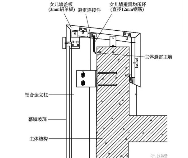此外,圆钢易于施工,材料易得,所以,建议优先采用圆钢。建筑幕墙接闪器布置时,对于第一类防雷的建筑物,避雷网网格尺寸不大于5m×5m(或6m×4m);第二类防雷的建筑物,避雷网网格尺寸不大于10m×10m(或12m×8m);第三类防雷的建筑物,避雷网网格尺寸不大于20m×20m(或24m×16m)。在建筑幕墙设计时,我们通常是将建筑幕墙顶部女儿墙的盖板部分,有目的地把它设计成幕墙接闪器,因为该部分处于建筑幕墙的顶部,常用3mm铝单板(或4mm铝塑板)作为盖板。