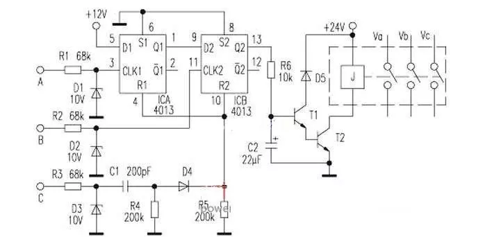 该电路主要由一片CD4013双D触发器构成。三相交流电经降压、整流后变换为低压脉冲信号输入到本电路的A、B、C端,A、B两端信号经过电阻和稳压二极管限幅、整形后,分别作为两个D触发器的时钟信号,C端信号经微分电路变为尖脉冲作用于两触发器的复位端R。